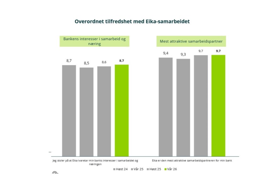 - Eika oppleves som en svært attraktiv samarbeidspartner (9,7 av 10), og bankene uttrykker sterk tilhørighettil Eika‑fellesskapet (9,3 av 10).